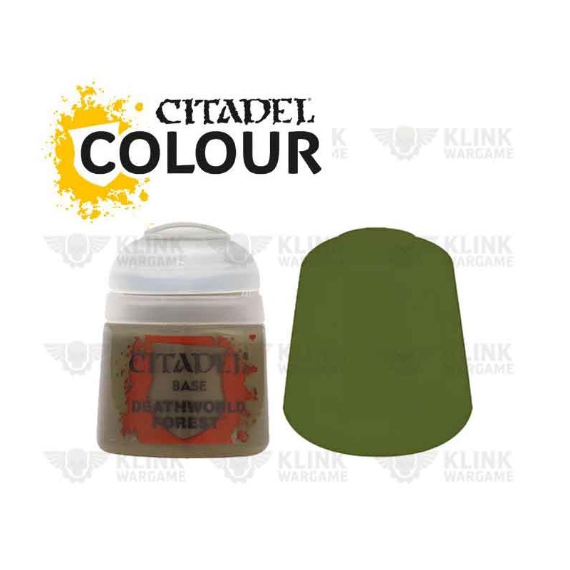 La Citadel Base Deathworld Forest offre une couvrance fiable et une teinte mate subtilement terreuse, idéale pour poser une base réaliste sans saturation excessive. Elle fonctionne très bien comme couleur principale pour des uniformes, des capes, des cuirs, ou comme base avant des éclaircissements plus clairs et des lavis sombres.