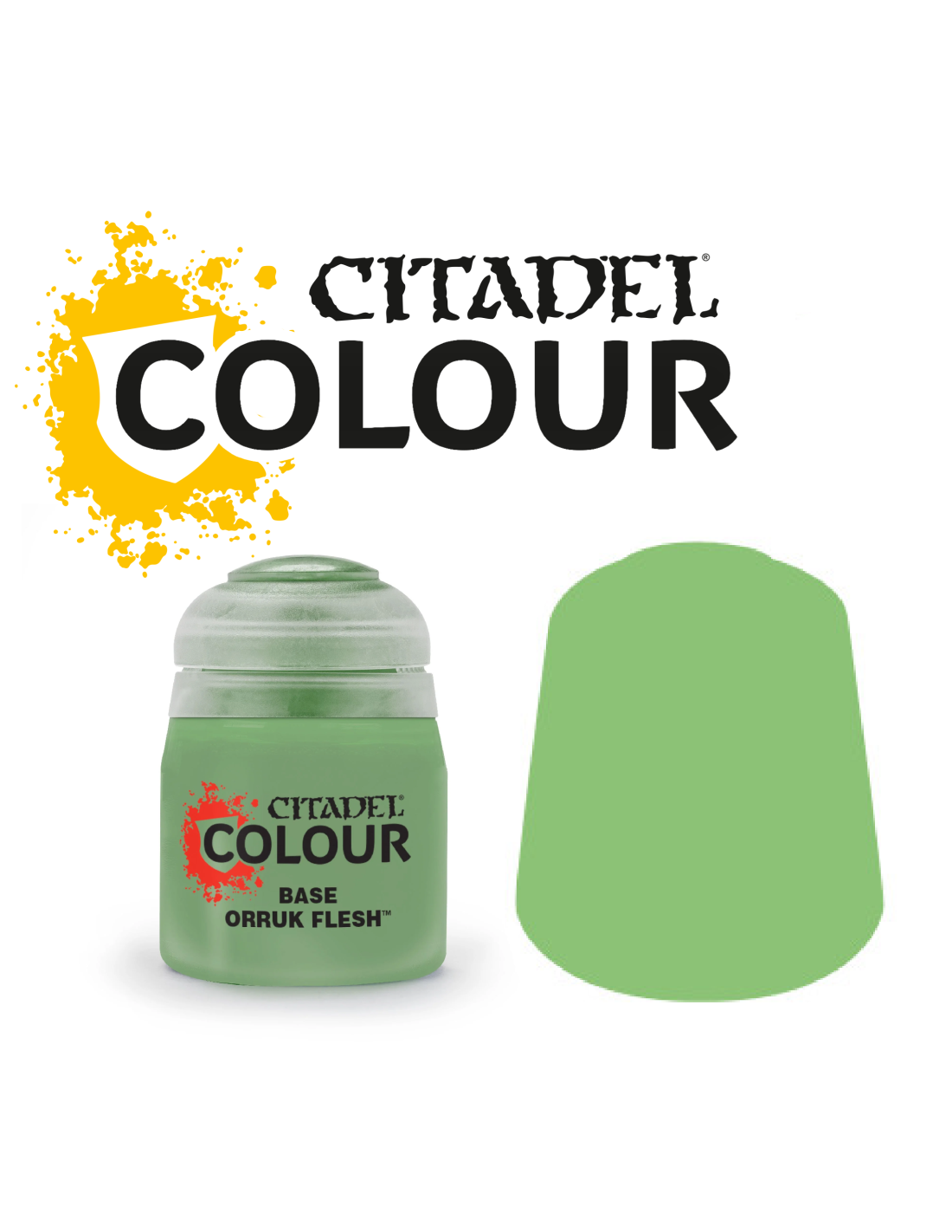 Orruk Flesh est une peinture acrylique Citadel Base, spécialement formulée pour offrir un fort pouvoir couvrant. Sa pigmentation verte intense en fait une excellente couleur de départ pour peindre les peaux des orruks, orks et autres créatures verdâtres, tout en préservant les détails sculptés.