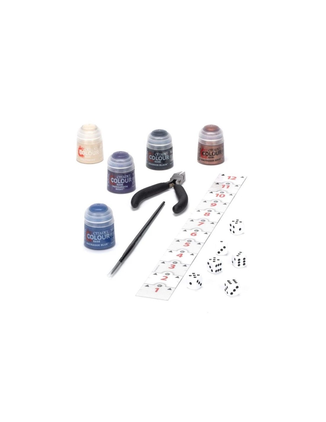 6 pots de peinture Citadel 12 ml (Abaddon Black; Wraithbone; Balthasar Gold; Naggaroth Nigh; Macragge Blue)
